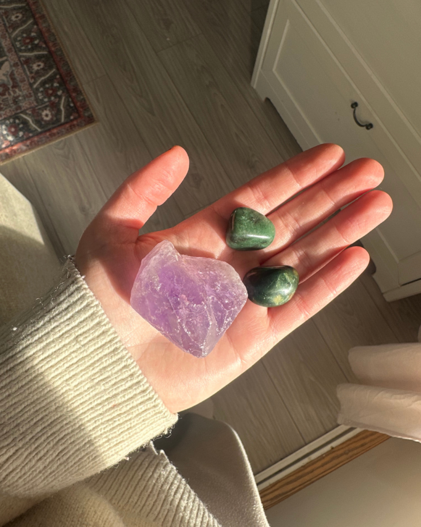 Asetin kaksi pienempää kristallia poskien päälle ja ametisti otsalle kulmakarvojen väliin (kolmas silmä).